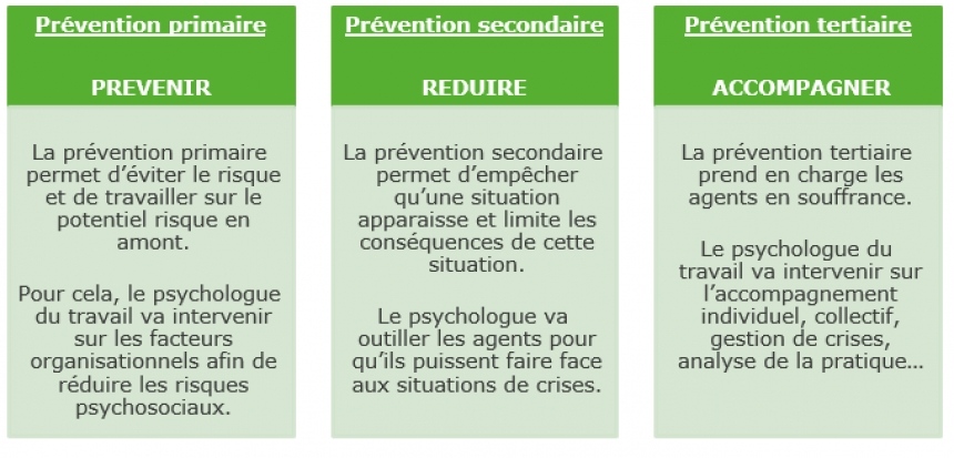 L’objectif du psychologue du travail est d’intervenir en prévention primaire (en amont de la dégradation totale des conditions de travail) afin que cela n’atteigne pas la santé mentale et physique des agents :